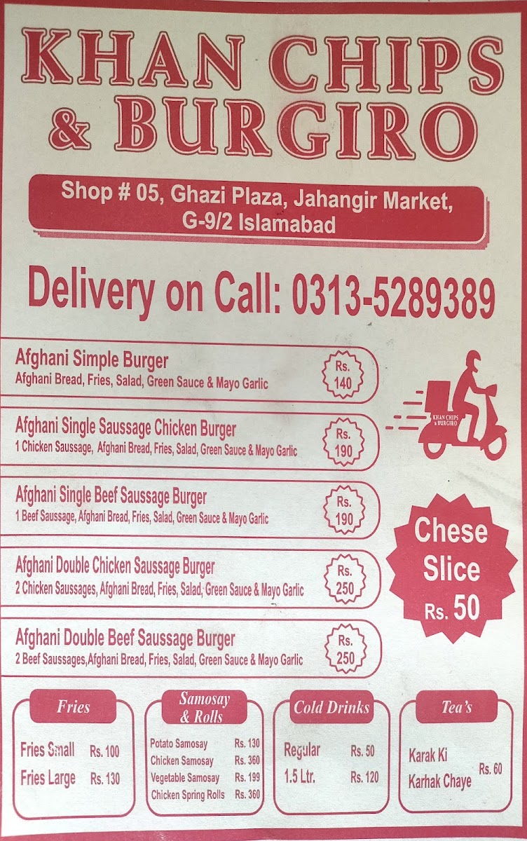 Welcome to Khan Chips & Burgiro, a delightful cafe nestled on Street 3 near Tapas Jahangir Market in Islamabad. Known for its affordable and delectable fast food, the menu features a variety of dishes that cater to every palate.